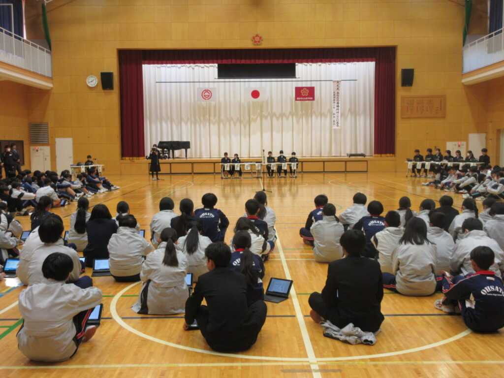 午後は全校で集まり、生徒総会を行いました。生徒会を中心に、委員会活動報告・活動計画、生活の決まりについて話し合いました。
